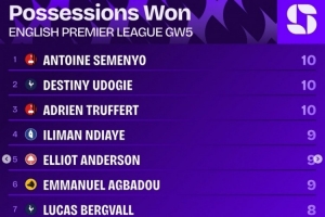 體育資訊9月24日訊 英超第5輪戰(zhàn)罷,squawkafootball列各項(xiàng)數(shù)據(jù)排行,塞梅尼奧、烏多吉、特呂費(fèi)爾是本輪奪回球權(quán)次數(shù)最多的球員,各有10次。