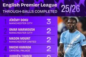 體育資訊9月24日訊 本賽季英超戰(zhàn)罷5輪,“Squawka”統(tǒng)計了所有球員成功完成直塞次數(shù)的排名,曼城邊鋒多庫以3次領跑。