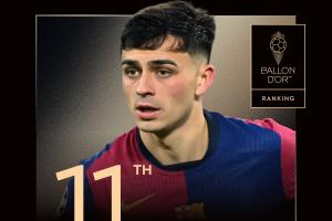 佩德里今年金球獎(jiǎng)排名第11名,落后第十的努諾-門德斯47分。