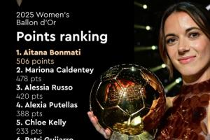 體育資訊09月27日訊 《法國足球》公布金球獎各排名得分情況,女足方面,邦馬蒂以506分奪得金球獎,領(lǐng)先第二的卡爾登泰28分。