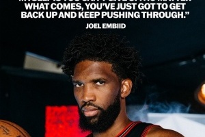 在照片上,附有恩比德的一段話:“我一直告訴自己的一件事就是,你不能放棄。無論遇到什么,你都必須重新站起來,堅(jiān)持下去。”