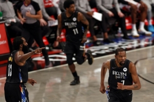 布魯克林籃網(wǎng)隊(duì):在2020-21賽季,當(dāng)杜蘭特和歐文健康回歸后,籃網(wǎng)隊(duì)通過交易得到了詹姆斯-哈登,組成了一個(gè)進(jìn)攻火力強(qiáng)大的三巨頭。然而,由于傷病問題,他們?cè)诔R?guī)賽中只一起打了8場(chǎng)比賽。