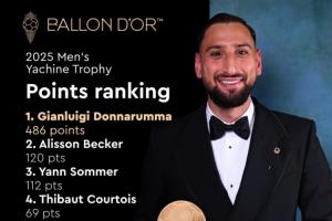 體育資訊09月27日訊 2025年雅辛獎排名詳情公布,榮獲該獎項的意大利門將多納魯馬以486分斷層領先,第2名阿利森獲得120分,第3名索默獲得112分。