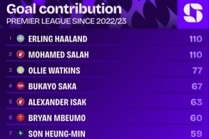 據(jù)Squawka的數(shù)據(jù)統(tǒng)計,自哈蘭德加盟曼城以來,他已經在英超聯(lián)賽直接參與110粒進球,同期沒有哪名球員比他更多,只有薩拉赫同樣參與110粒進球與他持平。