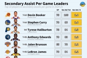 體育資訊9月28日訊 今天,數(shù)據(jù)媒體Extra列出了24-25賽季場(chǎng)均間接助攻(助攻傳球之前的那次傳球)前10,具體為: