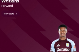 本場比賽沃特金斯在上半場為球隊先拔頭籌扳平比分,賽后他也當(dāng)選英超官方球迷票選全場最佳球員。