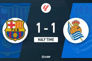 上半場傷停補時2分鐘,半場結(jié)束,巴薩暫1-1皇家社會。