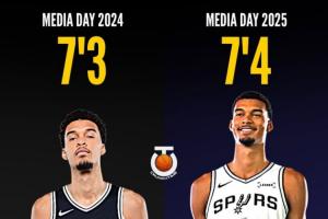 美媒從名單上發(fā)現(xiàn),21歲的文班亞馬長(zhǎng)高了1英寸,去年媒體日時(shí)他的身高是7英尺3英寸(約2米21),現(xiàn)在是7英尺4英寸(約2米24)。
