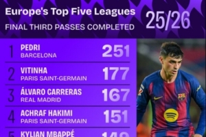 體育資訊10月1日訊 數(shù)據(jù)網(wǎng)站Squawka統(tǒng)計本賽季五大聯(lián)賽進攻三區(qū)完成傳球數(shù),巴薩中場佩德里斷檔領(lǐng)先,皇馬4人進入前十。