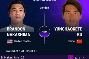 目前布云朝克特暫時(shí)1-2落后中島布蘭登,前三盤(pán)比分分別為:4-6、6-4、6-7(1)。