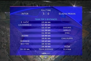 本場(chǎng)比賽國(guó)米方面跑動(dòng)距離最多的是蘇西奇的12.66km,其次為恰爾汗奧盧12.40km,之后分別是阿切爾比10.88km,迪馬爾科10.63km,巴斯托尼10.32km。