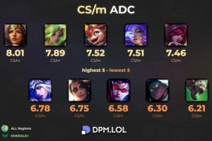 體育資訊10月1日訊 根據(jù)國外數(shù)據(jù)網(wǎng)站DPM.LOL統(tǒng)計,當前版本每分鐘補刀數(shù)最高及最低的ADC: