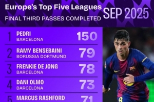體育資訊10月1日訊 巴薩在9月份的6場比賽中,取得5勝1平。其中巴薩中場佩德里功不可沒,他被喻為哈維和伊涅斯塔的結(jié)合體。據(jù)Squawka數(shù)據(jù)統(tǒng)計,在9月份歐洲五大聯(lián)賽進(jìn)攻三區(qū)成功傳球次數(shù)榜單中,佩德里以150次斷崖領(lǐng)先。