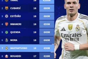 德轉(zhuǎn)世界U18球員身價(jià)榜(單位為歐元):