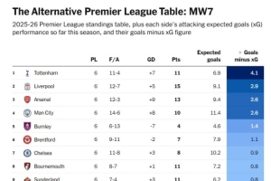 在本賽季英超預期進球值與實際進球值榜單中,熱刺是表現(xiàn)最好的,他們實際進球比預期進球多4.1個,利物浦(2.9個)、阿森納(2.6個)、曼城(2.6個)分居二至四位。