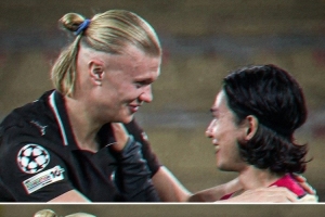 哈蘭德與南野拓實擁抱寒暄,此役哈蘭德為曼城打進(jìn)2球,而效力于摩納哥的南野拓實擔(dān)任替補未能出場。