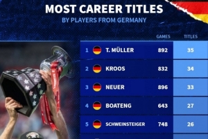 體育資訊10月2日訊 德國轉(zhuǎn)會市場統(tǒng)計了德國球員的冠軍數(shù)量,并列出榜單,隨溫哥華白浪贏得加拿大冠軍杯冠軍的穆勒以35冠居首,克羅斯34冠次席。