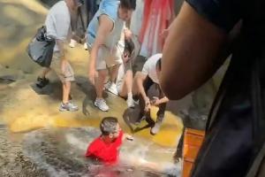 按道理情況下,那邊只能進兩到三個人,三到四個人一組。那邊比較小,站的位置不多。所以當時我們一下都進去了,都進去以后我先拍照,那我拍完照我肯定給朋友拍一拍吧,所以我蹲那給朋友拍照的時候,不知道被誰一腳踹水里了,其實那已經(jīng)很滑了。”