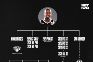 在當(dāng)年的交易中,籃網(wǎng)得到了米卡爾-布里奇斯、卡梅隆-約翰遜、4個無保護(hù)首輪簽、1個首輪簽互換權(quán)以及兩個次輪簽。之后,經(jīng)歷多筆交易,布里奇斯兌換成了5個首輪、1個首輪簽互換權(quán)以及一個次輪簽等資產(chǎn);4個無保護(hù)首輪中的其中3個,籃網(wǎng)將其和另一個來自獨行俠的首輪打包送到火箭,換回了自己的兩個首輪;約翰遜兌換成了小波特和一個首輪。