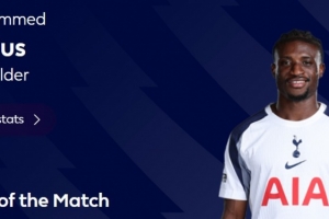 本場(chǎng)比賽熱刺球員庫(kù)杜斯發(fā)揮出色,打進(jìn)一球并且助攻一次,完成6次過人,賽后他也當(dāng)選英超官方球迷票選全場(chǎng)最佳球員。