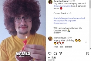 蓄發(fā)哥社媒曬出紀(jì)念蓄發(fā)一周年視頻,配文:“不剪頭發(fā)直到曼聯(lián)5連勝,已過去365天,當(dāng)前連勝狀態(tài)——1/5?!?/p>
