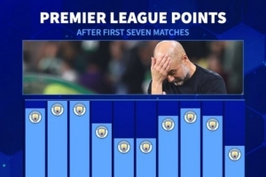 體育資訊10月6日訊 英超第7輪比賽,曼城客場1-0戰(zhàn)勝布倫特福德。德國轉(zhuǎn)會市場統(tǒng)計了瓜迪奧拉執(zhí)教曼城賽季前7輪比賽的積分,本賽季13分創(chuàng)新低。