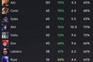 狐貍55場76%勝率;加里奧43場72%勝率;佐伊40場68%勝率;