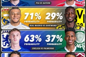 體育資訊7月2日訊 本屆世俱杯8強(qiáng)全部產(chǎn)生,Score90也對8強(qiáng)戰(zhàn)結(jié)果進(jìn)行了概率分析,具體如下: