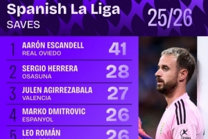 體育資訊10月7日訊 日前,Squawka統(tǒng)計(jì)了本賽季西甲撲救次數(shù)排行,皇家?jiàn)W維耶多門將埃斯坎德?tīng)栆?1次撲救居首。