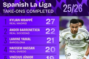 體育資訊10月7日訊 日前,Squawka統(tǒng)計了本賽季西甲過人次數(shù)排行,姆巴佩以27次過人居首。