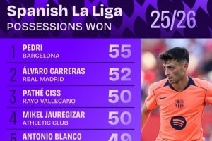 體育資訊10月7日訊 日前,Squawka統(tǒng)計(jì)了本賽季西甲奪回球權(quán)次數(shù)排行,佩德里55次居首,卡雷拉斯52次第二。