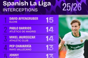 體育資訊10月7日訊 日前,Squawka統(tǒng)計了本賽季西甲攔截次數(shù)排行,巴里奧斯14次并列第2,瓊阿梅尼12次并列第6。