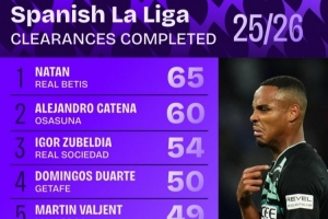 體育資訊10月7日訊 日前,Squawka統(tǒng)計了本賽季西甲解圍次數(shù)排行,貝蒂斯后衛(wèi)納坦65次居首,祖貝迪亞54次第三。