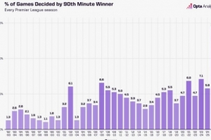 據(jù)統(tǒng)計,此占比數(shù)據(jù)是此前英超任何一個賽季的兩倍,此前最高的是23/24賽季,占比7.1%;上賽季90分鐘后打進(jìn)制勝球的比賽占比為5.8%。