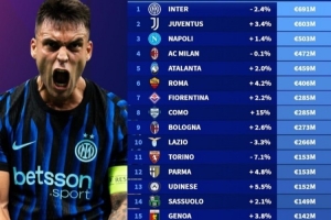 意甲俱樂(lè)部陣容身價(jià)排名(單位:億歐元):