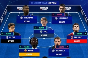 體育資訊10月8日訊 德轉(zhuǎn)更新了球員身價排名,意甲最貴首發(fā)11人也隨之出爐,國米的勞塔羅和圖拉姆領(lǐng)銜鋒線,AC米蘭球員普利西奇入選。