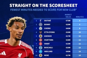 體育資訊10月8日訊 德國轉(zhuǎn)會市場統(tǒng)計了今夏新援攻入處子球的時間,并排出最快處子球榜單,埃基蒂克4分鐘攻入首球居首。
