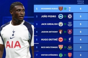 體育資訊10月9日訊 德國(guó)轉(zhuǎn)會(huì)市場(chǎng)盤(pán)點(diǎn)了英超新援參與進(jìn)球數(shù)據(jù),庫(kù)杜斯參與6球排名第一。