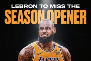 這也是詹姆斯生涯首次缺席常規(guī)賽揭幕戰(zhàn),此前他已經(jīng)連續(xù)出戰(zhàn)22次。