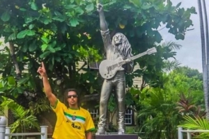 其他照片中還展示了孔德在金斯敦鮑勃-馬利故居博物館的身影,孔德在這位雷鬼音樂之王故居正門前的雕像旁擺出相同手勢合影留念。