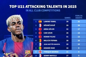 體育資訊10月11日訊 德國轉(zhuǎn)會市場列出了2025年五大聯(lián)賽U21球員參與進球榜,亞馬爾32球居首,杜埃26球次席。