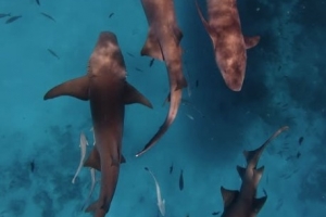 視頻中,庫(kù)巴西潛入海中游泳,并和一群鯊魚(yú)進(jìn)行互動(dòng)。