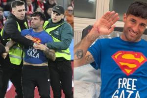 在今天凌晨的世界杯歐洲區(qū)預(yù)選賽,挪威主場(chǎng)5-0大勝以色列。比賽中有一名球迷沖進(jìn)球場(chǎng),脫下外套,展示自己所穿的寫(xiě)著“自由加沙”口號(hào)的T恤。比賽因此被短暫中斷,直到安保人員將其控制住。