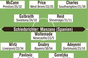 中場:斯賓塞(牛津聯(lián))、德文尼(水晶宮)、麥卡恩(普雷斯頓)、普萊斯(西布朗)、查萊斯(南安普頓)