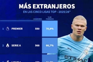 體育資訊10月14日訊 根據(jù)德國(guó)轉(zhuǎn)會(huì)市場(chǎng)的數(shù)據(jù),本賽季五大聯(lián)賽英超外籍球員占比最高,西甲外籍球員占比最低。