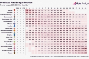 此外奪冠概率最高的是切爾西的2.6%。熱刺1.1%,曼聯(lián)為0%。
