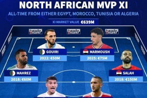 體育資訊10月15日訊 德國轉(zhuǎn)會市場列出了北非國家(埃及、摩洛哥、突尼斯、阿爾及利亞)球員歷史身價最高陣容,薩拉赫、馬赫雷斯、馬爾穆什在列。