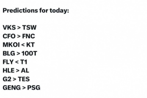 VKS戰(zhàn)勝TSW、CFO戰(zhàn)勝FNC、KT戰(zhàn)勝M(fèi)KOI、HLE戰(zhàn)勝AL、BLG戰(zhàn)勝100T、G2戰(zhàn)勝TES、T1戰(zhàn)勝FLY、GEN戰(zhàn)勝PSG。