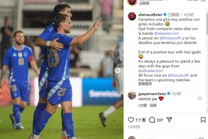 麥卡利斯特社媒曬出比賽照片,并寫道:“以兩粒進(jìn)球結(jié)束了積極的國(guó)際比賽日之旅,與國(guó)家隊(duì)伙伴們共度數(shù)日時(shí)光總是令人感到愉快?!?/p>