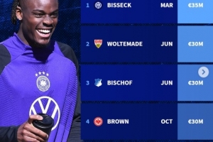 以下為2025年為德國隊上演首秀球員身價情況(首秀時間為當時所在俱樂部):
